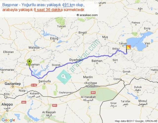 Başpınar - Yoğurtlu arası yaklaşık olarak 90 km/h ile yukarıda belirtilen sürede olup, iki yerin kuş uçuşu uzaklığı (mesafesi) 382'dir. Eğer belirtilen yerler arasında uçak seferi var ise bu süre uçakla 35 dakika'ya kadar düşebilir. Yolculuk otobüsle 8 saat 34 dakika sürmektedir.