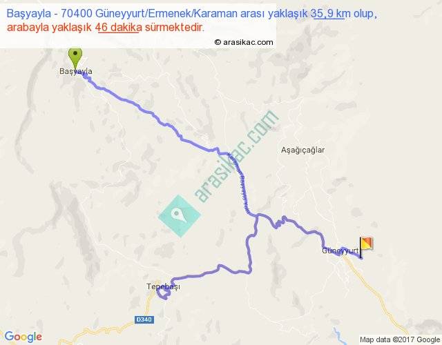Başyayla - 70400 Güneyyurt Ermenek Karaman arası yaklaşık olarak 90 km/h ile yukarıda belirtilen sürede olup, iki yerin kuş uçuşu uzaklığı (mesafesi) 15'dir. Yolculuk otobüsle 59 dakika sürmektedir.