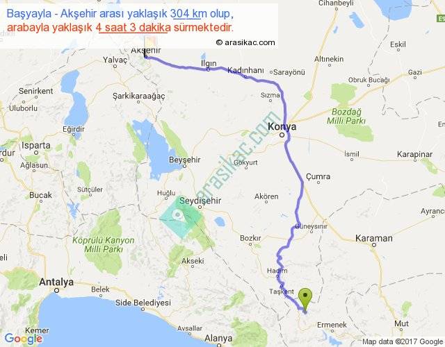 Başyayla - Akşehir arası yaklaşık olarak 90 km/h ile yukarıda belirtilen sürede olup, iki yerin kuş uçuşu uzaklığı (mesafesi) 209'dir. Yolculuk otobüsle 5 saat 15 dakika sürmektedir.