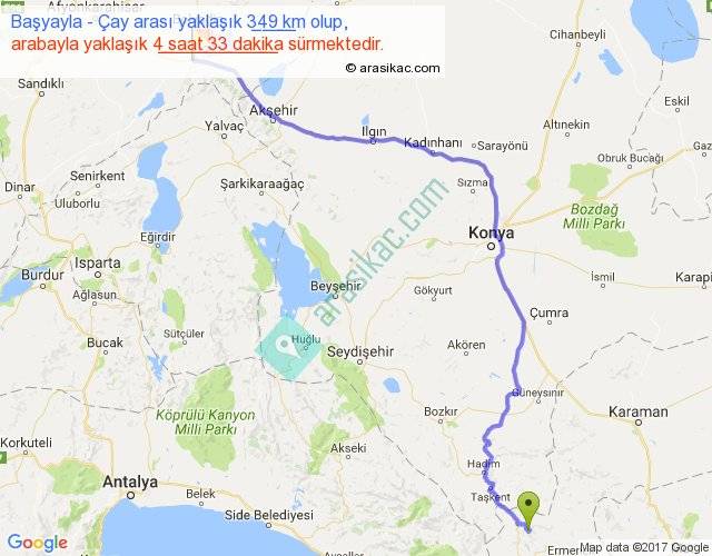Başyayla - Çay arası yaklaşık olarak 90 km/h ile yukarıda belirtilen sürede olup, iki yerin kuş uçuşu uzaklığı (mesafesi) 249'dir. Yolculuk otobüsle 5 saat 54 dakika sürmektedir.