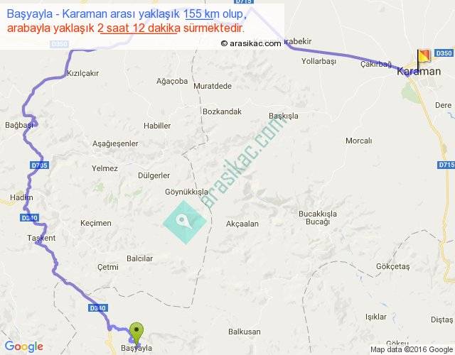 Başyayla - Karaman arası yaklaşık olarak 90 km/h ile yukarıda belirtilen sürede olup, iki yerin kuş uçuşu uzaklığı (mesafesi) 67'dir. Yolculuk otobüsle 2 saat 51 dakika sürmektedir.