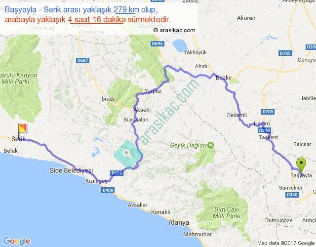 Başyayla - Serik arası yaklaşık olarak 90 km/h ile yukarıda belirtilen sürede olup, iki yerin kuş uçuşu uzaklığı (mesafesi) 140'dir. Yolculuk otobüsle 5 saat 32 dakika sürmektedir.