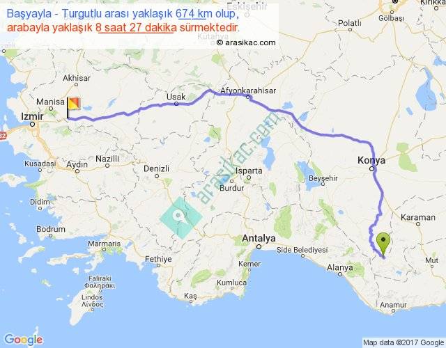 Başyayla - Turgutlu arası yaklaşık olarak 90 km/h ile yukarıda belirtilen sürede olup, iki yerin kuş uçuşu uzaklığı (mesafesi) 476'dir. Eğer belirtilen yerler arasında uçak seferi var ise bu süre uçakla 43 dakika'ya kadar düşebilir. Yolculuk otobüsle 10 saat 59 dakika sürmektedir.