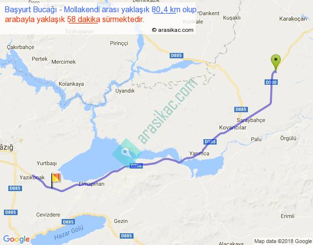 Başyurt Bucağı - Mollakendi arası yaklaşık olarak 90 km/h ile yukarıda belirtilen sürede olup, iki yerin kuş uçuşu uzaklığı (mesafesi) 61'dir. Yolculuk otobüsle 1 saat 15 dakika sürmektedir.