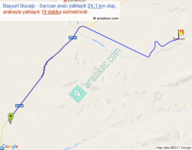 Başyurt Bucağı - Sarıcan arası yaklaşık olarak 90 km/h ile yukarıda belirtilen sürede olup, iki yerin kuş uçuşu uzaklığı (mesafesi) 19'dir. Yolculuk otobüsle 24 dakika sürmektedir.