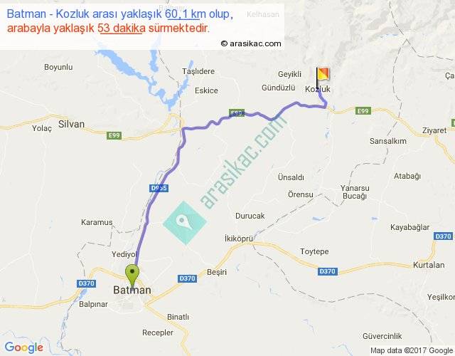 Batman - Kozluk arası yaklaşık olarak 90 km/h ile yukarıda belirtilen sürede olup, iki yerin kuş uçuşu uzaklığı (mesafesi) 46'dir. Yolculuk otobüsle 1 saat 7 dakika sürmektedir.