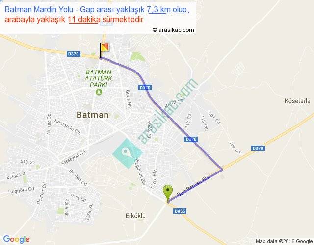 Batman Mardin Yolu - Gap arası yaklaşık olarak 90 km/h ile yukarıda belirtilen sürede olup, iki yerin kuş uçuşu uzaklığı (mesafesi) 5'dir. Yolculuk otobüsle 14 dakika sürmektedir.