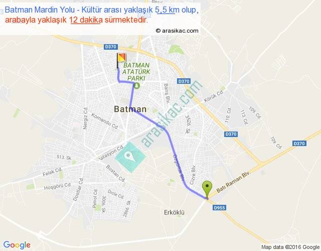 Batman Mardin Yolu - Kültür arası yaklaşık olarak 90 km/h ile yukarıda belirtilen sürede olup, iki yerin kuş uçuşu uzaklığı (mesafesi) 5'dir. Yolculuk otobüsle 15 dakika sürmektedir.