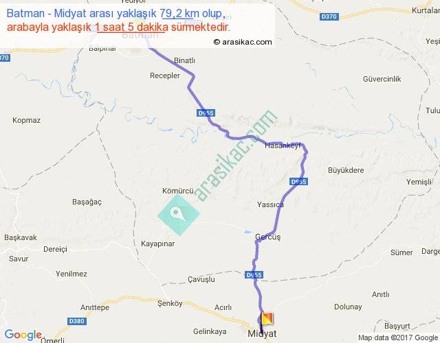 Batman - Midyat arası yaklaşık olarak 90 km/h ile yukarıda belirtilen sürede olup, iki yerin kuş uçuşu uzaklığı (mesafesi) 57'dir. Yolculuk otobüsle 1 saat 24 dakika sürmektedir.
