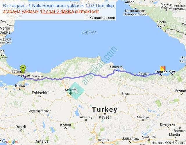 Battalgazi - 1 Nolu Beşirli arası yaklaşık olarak 90 km/h ile yukarıda belirtilen sürede olup, iki yerin kuş uçuşu uzaklığı (mesafesi) 866'dir. Eğer belirtilen yerler arasında uçak seferi var ise bu süre uçakla 1 saat 19 dakika'ya kadar düşebilir. Yolculuk otobüsle 15 saat 38 dakika sürmektedir.