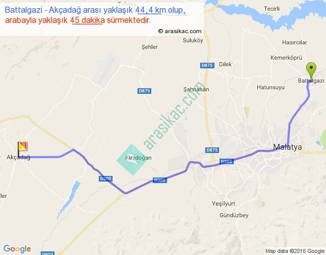 Battalgazi - Akçadağ arası yaklaşık olarak 90 km/h ile yukarıda belirtilen sürede olup, iki yerin kuş uçuşu uzaklığı (mesafesi) 35'dir. Yolculuk otobüsle 58 dakika sürmektedir.