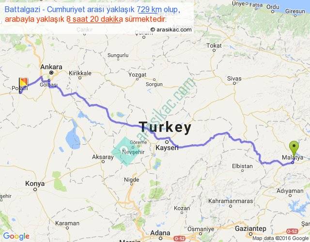 Battalgazi - Cumhuriyet arası yaklaşık olarak 90 km/h ile yukarıda belirtilen sürede olup, iki yerin kuş uçuşu uzaklığı (mesafesi) 549'dir. Eğer belirtilen yerler arasında uçak seferi var ise bu süre uçakla 50 dakika'ya kadar düşebilir. Yolculuk otobüsle 10 saat 50 dakika sürmektedir.