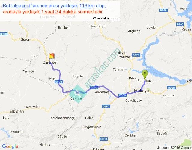Battalgazi - Darende arası yaklaşık olarak 90 km/h ile yukarıda belirtilen sürede olup, iki yerin kuş uçuşu uzaklığı (mesafesi) 77'dir. Yolculuk otobüsle 2 saat 2 dakika sürmektedir.