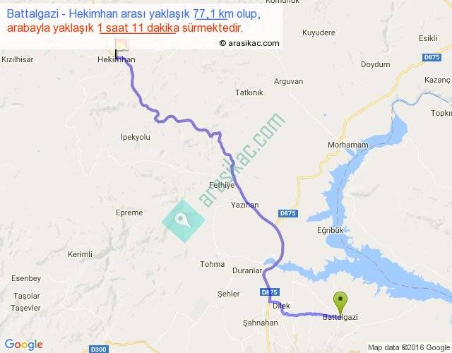 Battalgazi - Hekimhan arası yaklaşık olarak 90 km/h ile yukarıda belirtilen sürede olup, iki yerin kuş uçuşu uzaklığı (mesafesi) 57'dir. Yolculuk otobüsle 1 saat 32 dakika sürmektedir.