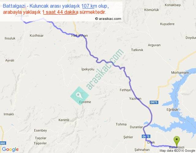Battalgazi - Kuluncak arası yaklaşık olarak 90 km/h ile yukarıda belirtilen sürede olup, iki yerin kuş uçuşu uzaklığı (mesafesi) 79'dir. Yolculuk otobüsle 2 saat 15 dakika sürmektedir.