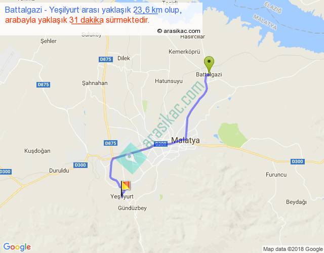 Battalgazi - Yeşilyurt arası yaklaşık olarak 90 km/h ile yukarıda belirtilen sürede olup, iki yerin kuş uçuşu uzaklığı (mesafesi) 18'dir. Yolculuk otobüsle 40 dakika sürmektedir.
