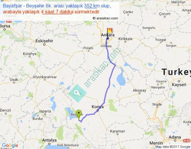Bayafşar - Beyşehir Sk. arası yaklaşık olarak 90 km/h ile yukarıda belirtilen sürede olup, iki yerin kuş uçuşu uzaklığı (mesafesi) 280'dir. Eğer belirtilen yerler arasında uçak seferi var ise bu süre uçakla 25 dakika'ya kadar düşebilir. Yolculuk otobüsle 5 saat 21 dakika sürmektedir.