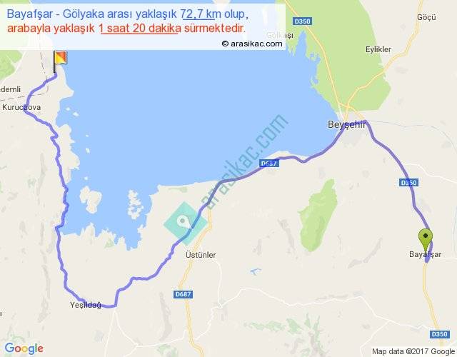 Bayafşar - Gölyaka arası yaklaşık olarak 90 km/h ile yukarıda belirtilen sürede olup, iki yerin kuş uçuşu uzaklığı (mesafesi) 35'dir. Yolculuk otobüsle 1 saat 44 dakika sürmektedir.