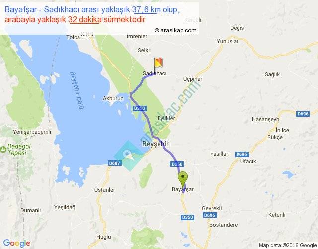 Bayafşar - Sadıkhacı arası yaklaşık olarak 90 km/h ile yukarıda belirtilen sürede olup, iki yerin kuş uçuşu uzaklığı (mesafesi) 29'dir. Yolculuk otobüsle 41 dakika sürmektedir.