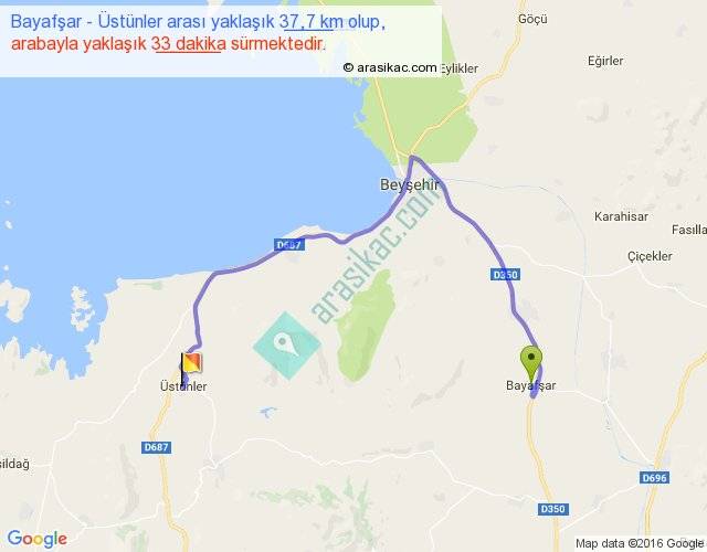 Bayafşar - Üstünler arası yaklaşık olarak 90 km/h ile yukarıda belirtilen sürede olup, iki yerin kuş uçuşu uzaklığı (mesafesi) 19'dir. Yolculuk otobüsle 42 dakika sürmektedir.