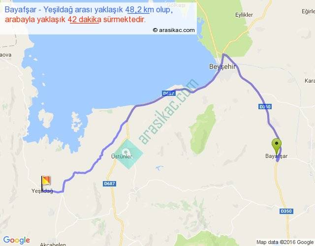 Bayafşar - Yeşildağ arası yaklaşık olarak 90 km/h ile yukarıda belirtilen sürede olup, iki yerin kuş uçuşu uzaklığı (mesafesi) 29'dir. Yolculuk otobüsle 54 dakika sürmektedir.