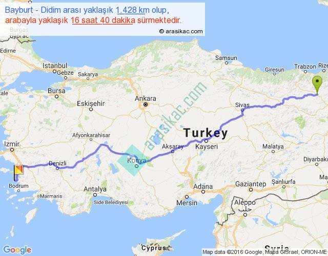 Bayburt - Didim arası yaklaşık olarak 90 km/h ile yukarıda belirtilen sürede olup, iki yerin kuş uçuşu uzaklığı (mesafesi) 1160'dir. Eğer belirtilen yerler arasında uçak seferi var ise bu süre uçakla 1 saat 47 dakika'ya kadar düşebilir. Yolculuk otobüsle 21 saat 40 dakika sürmektedir.