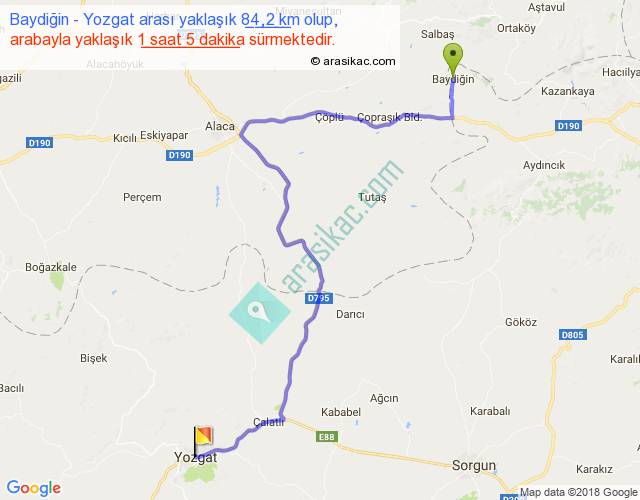 Baydiğin - Yozgat arası yaklaşık olarak 90 km/h ile yukarıda belirtilen sürede olup, iki yerin kuş uçuşu uzaklığı (mesafesi) 53'dir. Yolculuk otobüsle 1 saat 24 dakika sürmektedir.