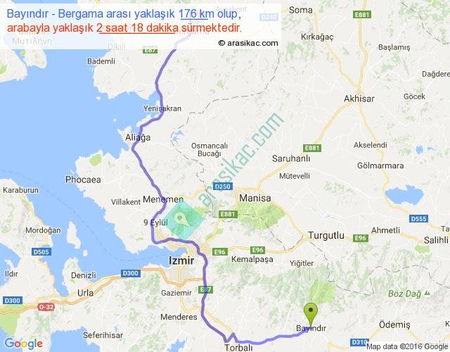 Bayındır - Bergama arası yaklaşık olarak 90 km/h ile yukarıda belirtilen sürede olup, iki yerin kuş uçuşu uzaklığı (mesafesi) 108'dir. Yolculuk otobüsle 2 saat 59 dakika sürmektedir.