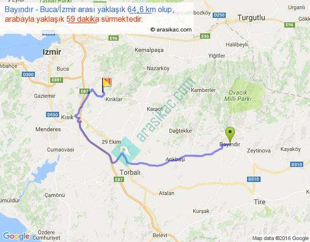 Bayındır - Buca İzmir arası yaklaşık olarak 90 km/h ile yukarıda belirtilen sürede olup, iki yerin kuş uçuşu uzaklığı (mesafesi) 34'dir. Yolculuk otobüsle 1 saat 16 dakika sürmektedir.
