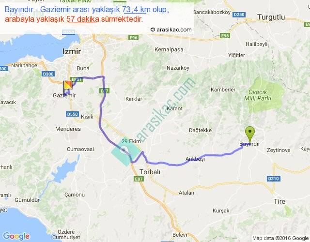 Bayındır - Gaziemir arası yaklaşık olarak 90 km/h ile yukarıda belirtilen sürede olup, iki yerin kuş uçuşu uzaklığı (mesafesi) 47'dir. Yolculuk otobüsle 1 saat 14 dakika sürmektedir.