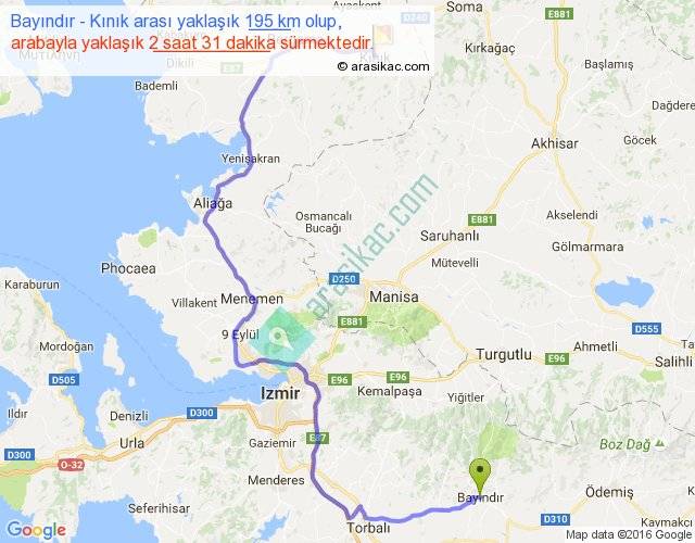 Bayındır - Kınık arası yaklaşık olarak 90 km/h ile yukarıda belirtilen sürede olup, iki yerin kuş uçuşu uzaklığı (mesafesi) 99'dir. Yolculuk otobüsle 3 saat 16 dakika sürmektedir.