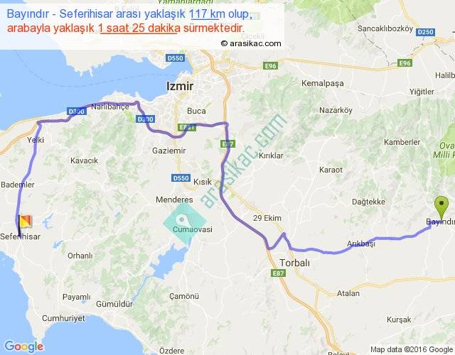 Bayındır - Seferihisar arası yaklaşık olarak 90 km/h ile yukarıda belirtilen sürede olup, iki yerin kuş uçuşu uzaklığı (mesafesi) 71'dir. Yolculuk otobüsle 1 saat 50 dakika sürmektedir.