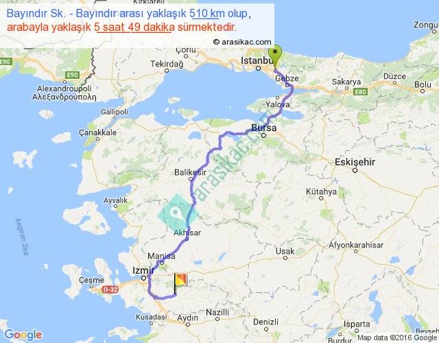 Bayındır Sk. - Bayındır arası yaklaşık olarak 90 km/h ile yukarıda belirtilen sürede olup, iki yerin kuş uçuşu uzaklığı (mesafesi) 336'dir. Eğer belirtilen yerler arasında uçak seferi var ise bu süre uçakla 31 dakika'ya kadar düşebilir. Yolculuk otobüsle 7 saat 33 dakika sürmektedir.