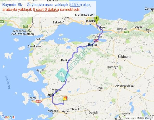 Bayındır Sk. - Zeytinova arası yaklaşık olarak 90 km/h ile yukarıda belirtilen sürede olup, iki yerin kuş uçuşu uzaklığı (mesafesi) 335'dir. Eğer belirtilen yerler arasında uçak seferi var ise bu süre uçakla 30 dakika'ya kadar düşebilir. Yolculuk otobüsle 7 saat 48 dakika sürmektedir.