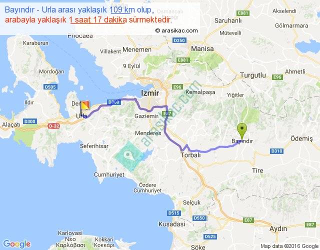 Bayındır - Urla arası yaklaşık olarak 90 km/h ile yukarıda belirtilen sürede olup, iki yerin kuş uçuşu uzaklığı (mesafesi) 77'dir. Yolculuk otobüsle 1 saat 40 dakika sürmektedir.