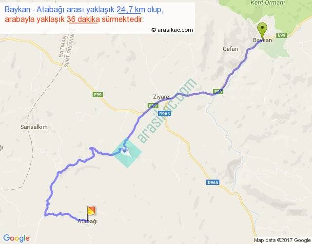 Baykan - Atabağı arası yaklaşık olarak 90 km/h ile yukarıda belirtilen sürede olup, iki yerin kuş uçuşu uzaklığı (mesafesi) 15'dir. Yolculuk otobüsle 46 dakika sürmektedir.