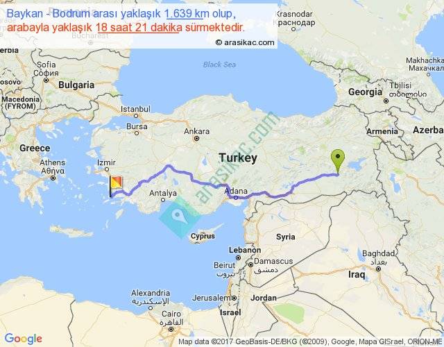 Baykan - Bodrum arası yaklaşık olarak 90 km/h ile yukarıda belirtilen sürede olup, iki yerin kuş uçuşu uzaklığı (mesafesi) 1262'dir. Eğer belirtilen yerler arasında uçak seferi var ise bu süre uçakla 1 saat 56 dakika'ya kadar düşebilir. Yolculuk otobüsle 23 saat 51 dakika sürmektedir.