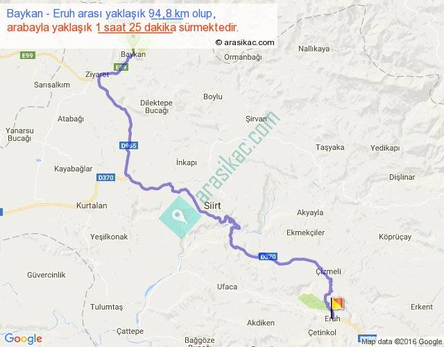 Baykan - Eruh arası yaklaşık olarak 90 km/h ile yukarıda belirtilen sürede olup, iki yerin kuş uçuşu uzaklığı (mesafesi) 57'dir. Yolculuk otobüsle 1 saat 50 dakika sürmektedir.
