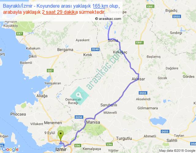 Bayraklı İzmir - Koyundere arası yaklaşık olarak 90 km/h ile yukarıda belirtilen sürede olup, iki yerin kuş uçuşu uzaklığı (mesafesi) 102'dir. Yolculuk otobüsle 3 saat 13 dakika sürmektedir.