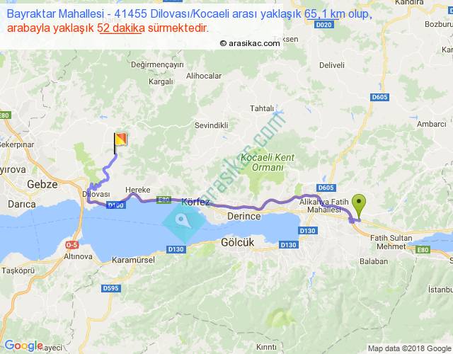Bayraktar Mahallesi - 41455 Dilovası Kocaeli arası yaklaşık olarak 90 km/h ile yukarıda belirtilen sürede olup, iki yerin kuş uçuşu uzaklığı (mesafesi) 41'dir. Yolculuk otobüsle 1 saat 7 dakika sürmektedir.