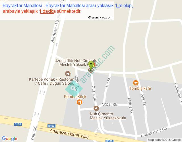 Bayraktar Mahallesi - Bayraktar Mahallesi arası yaklaşık olarak 90 km/h ile yukarıda belirtilen sürede olup, iki yerin kuş uçuşu uzaklığı (mesafesi) NAN'dir. Yolculuk otobüsle 1 dakika sürmektedir.