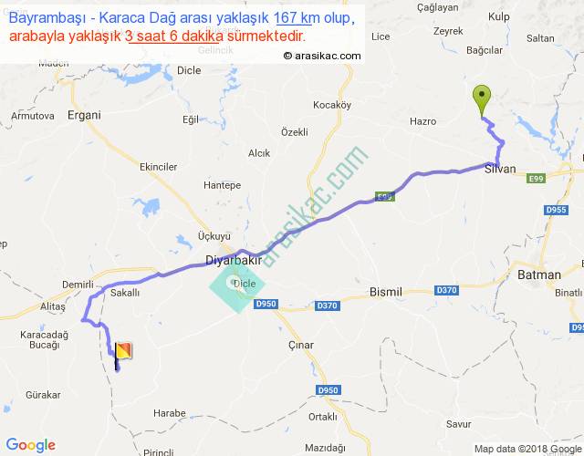 Bayrambaşı - Karaca Dağ arası yaklaşık olarak 90 km/h ile yukarıda belirtilen sürede olup, iki yerin kuş uçuşu uzaklığı (mesafesi) 117'dir. Yolculuk otobüsle 4 saat 1 dakika sürmektedir.