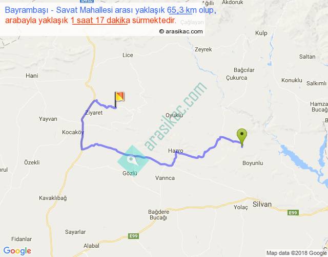 Bayrambaşı - Savat Mahallesi arası yaklaşık olarak 90 km/h ile yukarıda belirtilen sürede olup, iki yerin kuş uçuşu uzaklığı (mesafesi) 31'dir. Yolculuk otobüsle 1 saat 40 dakika sürmektedir.