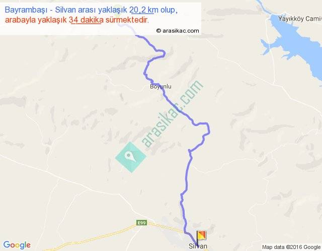 Bayrambaşı - Silvan arası yaklaşık olarak 90 km/h ile yukarıda belirtilen sürede olup, iki yerin kuş uçuşu uzaklığı (mesafesi) 14'dir. Yolculuk otobüsle 44 dakika sürmektedir.