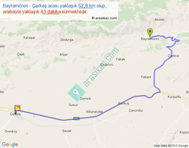 Bayramören - Çerkeş arası yaklaşık olarak 90 km/h ile yukarıda belirtilen sürede olup, iki yerin kuş uçuşu uzaklığı (mesafesi) 30'dir. Yolculuk otobüsle 55 dakika sürmektedir.