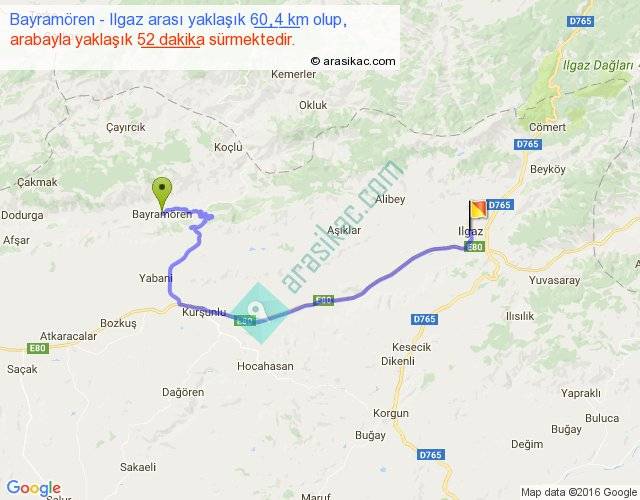 Bayramören - Ilgaz arası yaklaşık olarak 90 km/h ile yukarıda belirtilen sürede olup, iki yerin kuş uçuşu uzaklığı (mesafesi) 35'dir. Yolculuk otobüsle 1 saat 7 dakika sürmektedir.