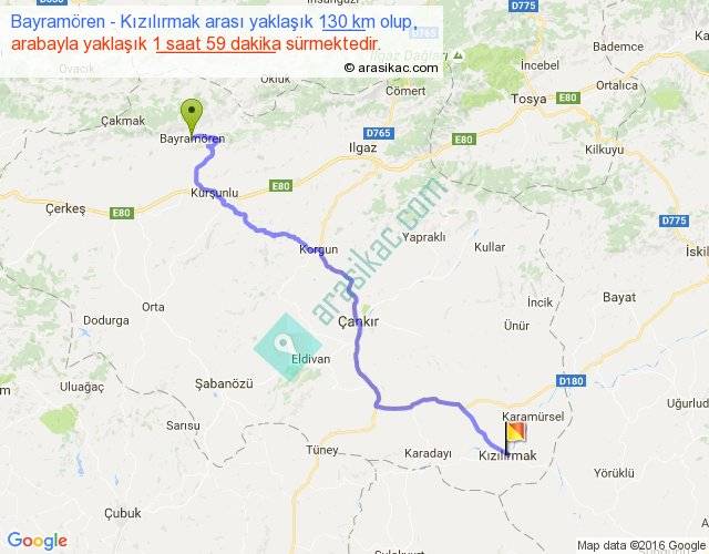 Bayramören - Kızılırmak arası yaklaşık olarak 90 km/h ile yukarıda belirtilen sürede olup, iki yerin kuş uçuşu uzaklığı (mesafesi) 93'dir. Yolculuk otobüsle 2 saat 34 dakika sürmektedir.