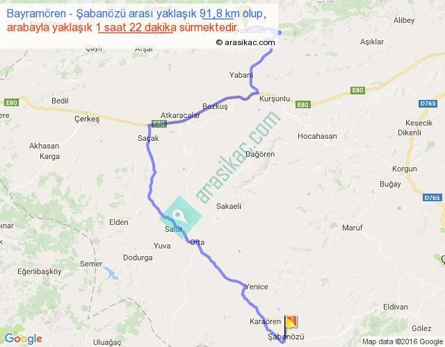 Bayramören - Şabanözü arası yaklaşık olarak 90 km/h ile yukarıda belirtilen sürede olup, iki yerin kuş uçuşu uzaklığı (mesafesi) 51'dir. Yolculuk otobüsle 1 saat 46 dakika sürmektedir.