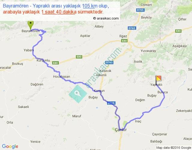 Bayramören - Yapraklı arası yaklaşık olarak 90 km/h ile yukarıda belirtilen sürede olup, iki yerin kuş uçuşu uzaklığı (mesafesi) 52'dir. Yolculuk otobüsle 2 saat 10 dakika sürmektedir.