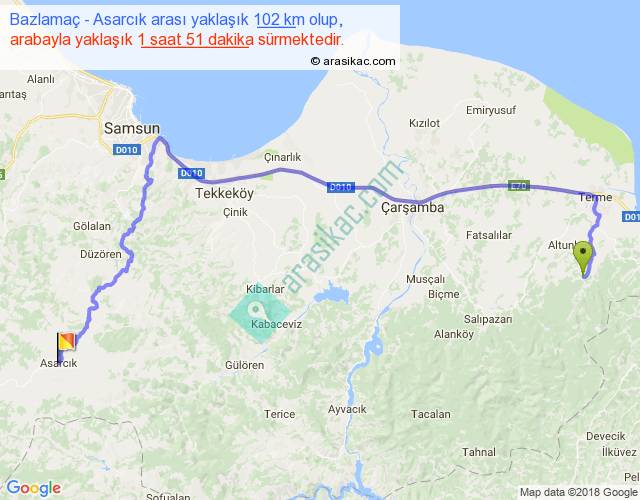 Bazlamaç - Asarcık arası yaklaşık olarak 90 km/h ile yukarıda belirtilen sürede olup, iki yerin kuş uçuşu uzaklığı (mesafesi) 61'dir. Yolculuk otobüsle 2 saat 24 dakika sürmektedir.